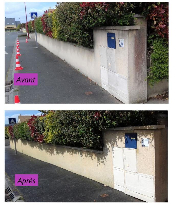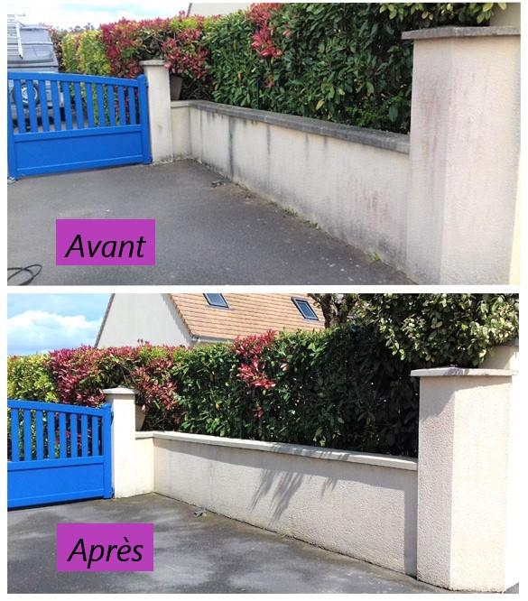 Les murets extérieurs comportaient des traces de pollutions lièes à la rue passagère. Ils ont été préalablement nettoyés sous pression régulée puis traités avec ce même traitement curatif et préventif que les pignons.