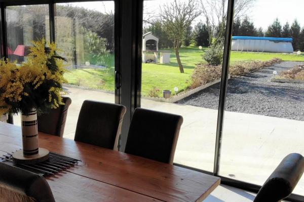 Demandes spécifiques du client : voir les poutres au plafond, donc vol à 25 /30 cm des poutres ce qui est une source de turbulences (contrairement à un plafond lisse). Le client souhaitait également un plan permettant d'avoir une vue sur le jardin et la piscine depuis la véranda.